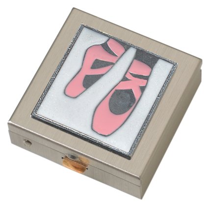 The Ballet Slipper Small pill box has a cast pewter emblem that is hand colored with durable enamel. The polished stainless steel pill box is 1 1/2" X 1 1/2" . Keep your everyday supplements, pain relief tablets or breath mints close at hand. Great gift for men or women. Fits comfortably in a pants pocket or a purse. Choose an emblem design to express your individuality. Packaged in our Ahlers Designs gift box.