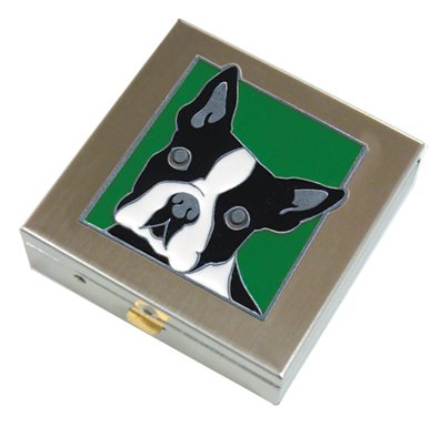 The Boston Terrier emblem is hand cast pewter. Each color is individually hand painted with durable enamel. This designer large pill box is well constructed of brushed steel and measures 2" x 2" x 5/8" with an inside divider to organize your supplements. Comes packaged in a custom Ahlers Designs box. Keep your vitamins and medication close at hand with this stylish pill box.