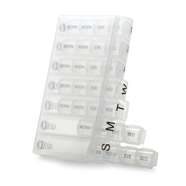 - Contains 7 individual, removable organizers each with 4 divided compartments: Morn, Noon, Eve, and Bed
