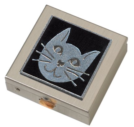 The Black Kitty Cat Small pill box has a cast pewter emblem that is hand colored with durable enamel. The polished stainless steel pill box is 1 1/2" X 1 1/2" . Keep your everyday supplements, pain relief tablets or breath mints close at hand. Great gift for men or women. Fits comfortably in a pants pocket or a purse. Choose an emblem design to express your individuality. Packaged in our Ahlers Designs gift box.