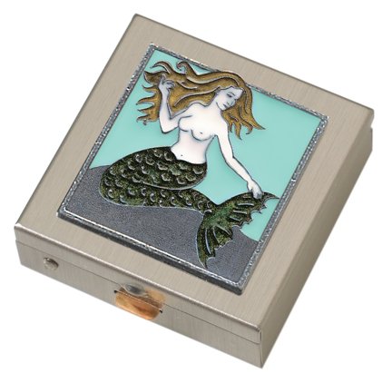 The Green Mermaid Small pill box has a cast pewter emblem that is hand colored with durable enamel. The polished stainless steel pill box is 1 1/2" X 1 1/2" . Keep your everyday supplements, pain relief tablets or breath mints close at hand. Great gift for men or women. Fits comfortably in a pants pocket or a purse. Choose an emblem design to express your individuality. Packaged in our Ahlers Designs gift box.