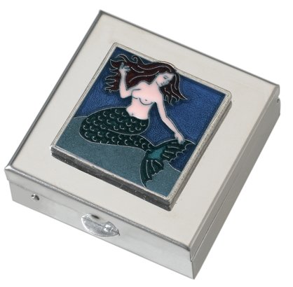 The Green Dragonfly emblem is made of hand cast pewter. Each color is individually hand painted with durable enamel. This attractive mirror pill box is constructed of aluminum in a matte finish. The case measures 2 1/2 " x 2 1/4" x 1/2" with an inside divider to keep supplements organized. Carry your pills with style and keep them close at hand. Inside mirror is helpful for those quick on the spot checks. Great gift for people on the go.